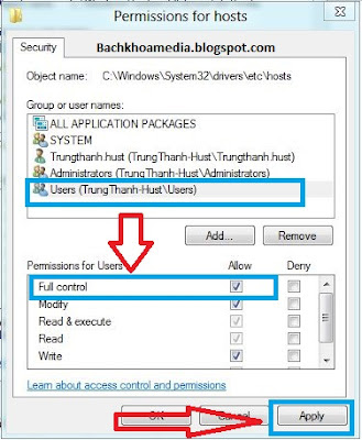 Bước 3: Nhấn vào Users để chỉnh sửa sao đó chọn Full Control - Apply - OK.